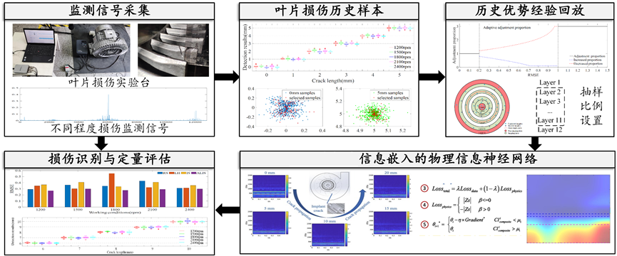 (2)团队聚焦压缩机与鼓风机叶片的损伤识别开展了大量的研究,结合物理信息网络提出了透平叶片裂纹损伤识别方法,通过构建叶片裂纹损伤定量映射模型提出了基于历史信息回放的透平叶片裂纹损伤定量评估方法,从而实现叶片损伤的有效监测与可靠评估,为风机叶片损伤识别和状态监测奠定理论和技术基础。