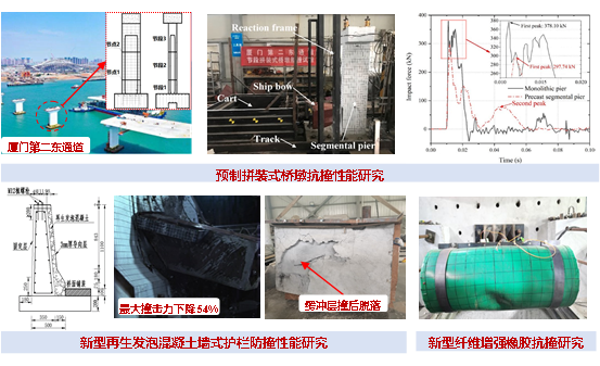 本期人物 个人简介 张新晨,南京工业大学土木工程学院副教授,江苏省振动工程学会土木结构振动控制与冲击防护专业委员会秘书长,江苏省“双创博士”。本硕毕业于哈尔滨工业大学,博士毕业于新加坡南洋理工大学,曾担任新加坡国立大学研究员。主持国家自然科学基金青年项目(C类)、中国博士后科学基金面上项目、江苏省教育厅面上项目(A类)、江苏省“双创博士”计划项目等多项国家级、省部级科研项目,曾参与新加坡建筑发展署、陆路交通管理局“未来城市”项目及巴拿马第四运河防撞专题等国际项目。在ASCE Journal of Structural Engineering、Engineering Structures、中国公路学报等权威期刊发表论文30余篇。获江苏省科学技术二等奖、中国航海学会科技进步二等奖、江苏省土木建筑学会科学技术一等奖等荣誉。 科研情况 长期致力于既有工程结构的服役安全评估与综合性能提升方面的探索和创新,将绿色高性能材料、复合材料等与消能技术结合,并开展其应用于既有基础设施的提质改造方面的研究,具体如下: (1)既有老旧结构劣化性能评估方面的研究创新 针对老旧结构的性能评估开展了系列研究,取得了一定的创新研究成果。理论研究层面,提出了考虑材料老化作用的改进梁柱节点拉压杆力学模型,理论上解决了因材料老化导致的节点破坏模式演化(梁端弯曲-节点剪切)准确获取问题;拓展了临界剪切裂缝理论在考虑材料老化情况下的表达,构建了钢筋混凝土板残余抗冲切承载力模型。试验研究层面,分别开展了锈蚀钢筋混凝土梁柱内、外节点抗震性能,板抗冲切性能的试验与模拟,探究了轴压比等关键参数对于节点性能的影响,提出了基于数据驱动的锈蚀劣化节点承载力预测模型。 (2)工程结构抗撞方面的研究创新 针对工程结构抗撞问题进行了一定的探索,基于厦门第二东通道节段拼装式桥墩开展了模拟船撞试验,分析了撞击能量、撞击高度等参数对结构损伤模式、最大撞击力的影响,提出了预制拼装桥墩船撞响应预测模型;设计了一种基于再生泡沫混凝土的新型缓冲防撞护栏并开展了台车撞击试验,对比了不同车型撞击下的加速度和撞击力削减,验证了其有效性并提出了设计方法;构建了一种新型纤维增强橡胶防冲击装置,基于撞击试验和数值模拟分析了其动力响应,优化了其相关设计参数及设计方法。 (3)既有结构综合性能提升 基于高性能材料、复合材料结构等对既有工程结构的综合性能提升开展了系列研究,采用水泥基增强复合材料(ECC)、高性能混凝土(UHPC)分别对混凝土梁柱节点、梁的剪切性能进行加固,并提出了力学桁架分析模型;开展了以冲击荷载为对象的复材构件构型创新研究工作,提出了泡沫填充的格构增强复合材料梁构件、波纹格构增强的复材三明治结构等,并基于低速冲击试验和参数模拟分析,提出了构型优化设计方法。 科研体悟 科研的路上满是反复试错的迷茫,而每一次突破认知边界的收获,都是对执着探索最好的回应。