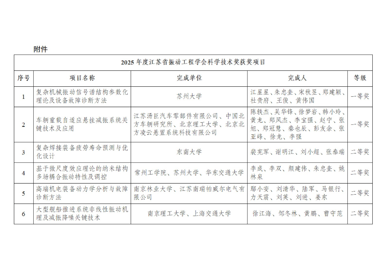 根据《江苏省振动工程学会科学技术奖励实施细则》规定,经形式审查、同行函评、会议评审、常务理事会审议、公示等程序,决定授予“复杂机械振动信号谱结构参数化理论及设备故障诊断方法”等2个项目科学技术一等奖,授予“复杂焊接装备疲劳寿命预测与优化设计”等4个项目科学技术二等奖,授予陈强等7人青年科技奖,授予温晶晶卓越工程师奖,授予宋狄优秀博士奖。